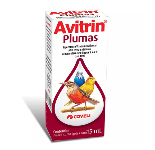 O Avitrin Coveli Plumas 15ml deixa a plumagem do seu pássaro ainda mais bonita! É composto por vitaminas e zinco, nutrientes essenciais para melhorar e manter a beleza da pele e das penas. O medicamento pode ser utilizado durante todos os períodos de vida. Uso interno (gotas), diluído em água. Siga atentamente as orientações da bula.