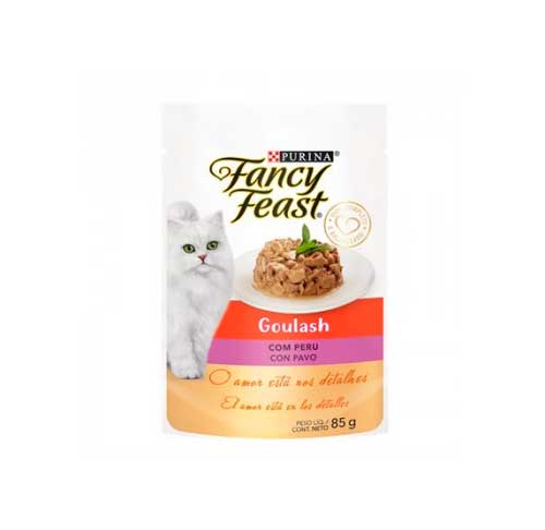 Água,carne mecanicamente separada de peru (9%),glúten de trigo,carne mecanicamente separada defrango,amido de milho, carcaça de frango, cloreto de sódio (sal comum), fígado de frango, miúdos de suínos,glicina,fosfato bicálcico, dextrose,cloreto de potássio, carbonato de cálcio, corantecaramelo,vitaminas (A, D3, E, K3, B12, B1, B2, B6, niacina, biotina, ácido fólico, pantotenato de cálcio,cloreto de colina), taurina, minerais (sulfato de zinco, sulfato ferroso, sulfato de manganês, sulfato de cobre, proteinato de zinco, proteinato de ferro,proteinato de manganês, proteinato de cobre, proteinato de selênio, iodato de cálcio, selenito de sódio).Eventuais substitutivos:fígado de suíno,fígado de peru.