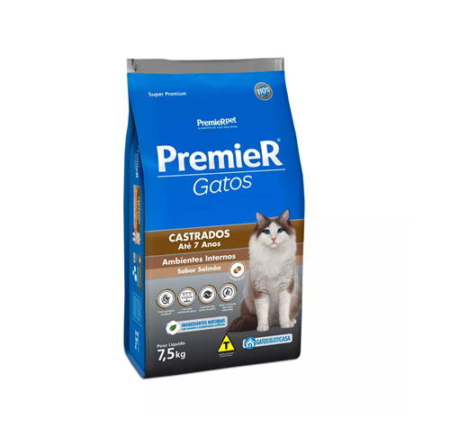 [Produtos] - Ração Premier Ambientes Internos para Gatos Adultos Castrados até 7 Anos Sabor Salmão - 7,5Kg