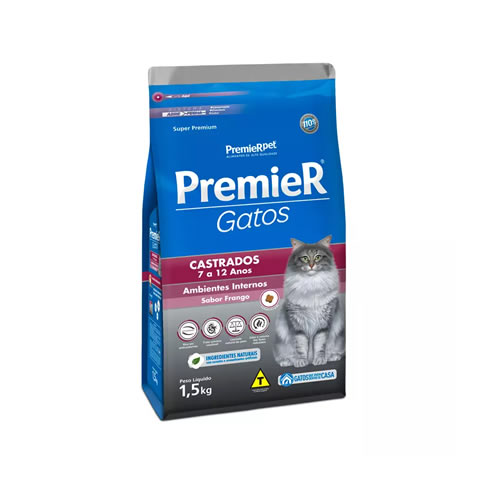 [Produtos] - Ração Premier Ambientes Internos para Gatos Adultos Castrados de 7 a 12 Anos Sabor Frango - 1,5Kg