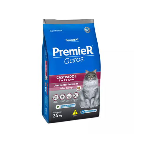 Ração Premier Ambientes Internos para Gatos Adultos Castrados de 7 a 12 Anos Sabor Frango - 7,5Kg