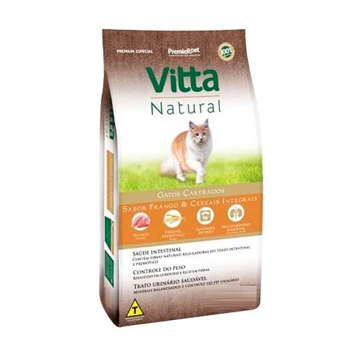 A linha Vitta Natural é formulada com proteínas de alta qualidade e enriquecida com todas as vitaminas e minerais necessários para que os gatos vivam saudáveis e felizes. Elaborado com ingredientes naturais e cuidadosamente selecionados, o produto Vitta Natural Gatos Castrados Sabor Frango, além de muito saboroso, não possui corantes e aromatizantes artificiais. Promove também a saúde intestinal, através da associação de fibras naturais e prebiótico, auxilia no controle de peso, por meio do teor reduzido de gorduras e rico em fibras, e para um trato urinário saudável, contém minerais balanceados e controle do pH.