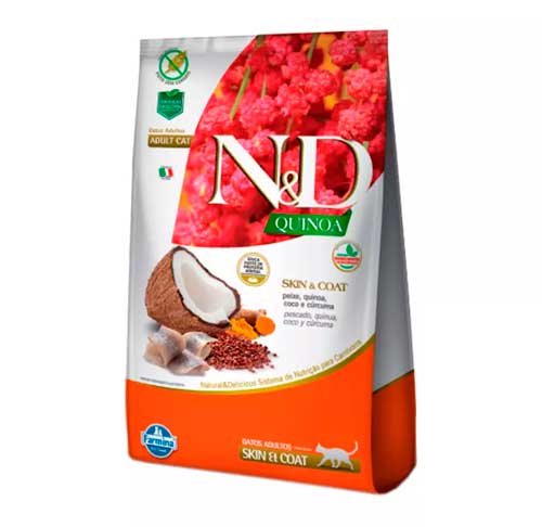 carne de peixe (mín. 20%), farinha de peixe, quinoa (mín. 8%), amido de batata, óleo de frango, óleo de peixe, psyllium, linhaça, levedura de cerveja, coco desidratado (mín. 0,15%), extrato de cúrcuma (mín. 0,15%), extrato de chá verde, extrato de aloe vera, betacaroteno, luteína, fruto-oligossacarídeos, mannan-oligossacarídeos, DL-metionina, taurina, L-carnitina, sulfato de condroitina, sulfato de glucosamina, zeolita, hidrolisado de fígado de frango e/ou suíno, vitaminas (A, D3, E, K3, B1, B2, B6, B12, C, biotina, niacina, ácido pantotênico, ácido fólico, cloreto de colina), cloreto de potássio, carbonato de cálcio, fosfato bicálcico, ácido fosfórico, ferro orgânico, cobre orgânico, zinco orgânico, manganês orgânico, selênio orgânico, iodato de cálcio, propionato de cálcio, antioxidante natural (concentrado de tocoferóis). Eventual substitutivo: proteína hidrolisada de peixe.
