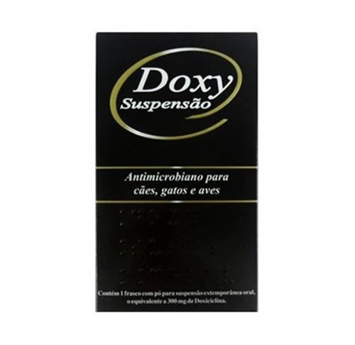 Antibiótico à base de DOXICICLINA, considerada droga de eleição no controle das infecções causadas pelas principais espécies de riquétsias, micoplasma, espiroquetas e clamídias. DOXY SUSPENSÃO é um produto a base de doxiciclina, reconhecido como o medicamento de eleição para o controle das infecções causadas pelas principais espécies de riquetsias, micoplasmas, espiroquetas e clamídias que acometem cães, gatos, aves e animais silvestres. DOXY SUSPENSÃO apresenta eficácia clínica e segurança comprovada em inúmeros testes clínicos nas várias patologias onde o antibiótico é recomendado. DOXY SUSPENSÃO é apresentada sob a forma de pó para suspensão oral, contendo o equivalente a 300 mg de Doxiciclina, para diluição em água mineral ou filtrada. O produto após diluído poderá ser mantido a temperatura ambiente por no máximo 14 dias. DOXY SUSPENSÃO é indicada para cães e gatos, no tratamento de: ERLICHIOSE CANINA- causada por Erlichia canis.L