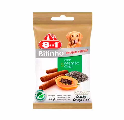 Miúdos bovinos, carne mecanicamente separada de aves (cms), proteína de soja, umectante amido, glicose, chia, polpa de mamão desidratada, cloreto de sódio (sal comum), estabilizante conservante, glutamato monossódico antioxidante