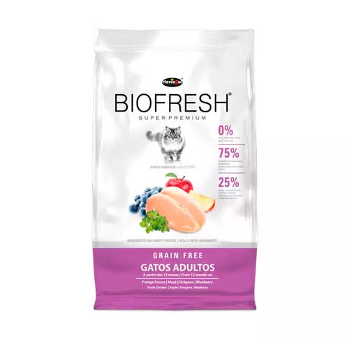 Seleção de carnes frescas (carne de frango e fígado de frango) (mín. 20%), seleção de frutas, vegetais e ervas frescas (maçãs, cenouras, beterrabas e orégano) (mín. 2%), farinha de proteína isolada de suínos, óleo de peixe refinado (fonte natural de EPA e DHA), farinha de vísceras de frango e óleo de frango (preservados naturalmente com tocoferóis), extratos botânicos (blueberry (mirtilo), yucca e chá verde) (mín. 0,1%), ovos desidratados, farinha de mandioca, hidrolisado de frango, polpa de beterraba, ervilhas desidratadas, polpa de tomate, levedura de cerveja, prebióticos (parede celular de levedura (MOS) e inulina), zeólita, hexametafosfato de sódio, cloreto de sódio (sal comum), taurina, DL-metionina, L-lisina, cloreto de potássio, cloreto de colina, vitaminas (A, B1, B2, B6, B12, C, D3, E, K3, ácido fólico, ácido pantotênico, biotina e niacina), minerais aminoácido-quelatados (cobre, ferro, manganês, zinco, selênio), iodato de cálcio e antioxidantes naturais (blend de tocoferóis e ácido cítrico).