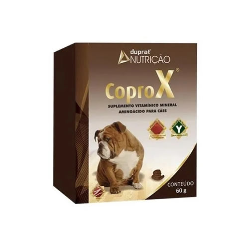 O Suplemento Vitamínico Duprat Coprox para Cães contém em sua fórmula componentes que tornam as fezes não palatáveis e menos atrativas, inibindo sua ingestão, além de reduzir o stress. É indicado em todas as fases da vida. Modo de Usar: Oferecer ao animal diretamente na boca ou misturado ao alimento 2 gramas/10 Kg de peso vivo, duas vezes ao dia ou segundo critério do médico veterinário. Dose da Colher: Uma medida corresponde 0 2g. Modo de Conservação: Conservar na embalagem original, fechado, em lugar seco e fresco com temperatura entre 15 ºC e 30 ºC , ao abrigo da Luz solar e fora do alcance de crianças. Especificações Indicação Cachorros  Raças Pequenas, Raças Médias, Raças Grandes Idade Filhotes, Adultos, Idosos Composição Extrato de Salsinha Moída, Extrato de Yucca, Extrato de Pimenta, Extrato de Alcaçus, Triptofano, Acido Glutâmico, Vitamina B1 , Amilase .Marca Duprat