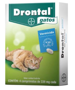 Drontal Gatos® é indicado para o tratamento e controle das verminoses intestinais em gatos, apresentando excelentes resultando contra parasitas cestoides (vermes chatos) e nematódeos (vermes redondos). Drontal Gatos® contém quatro comprimidos de 339mg cada, que trata entre 3 e 4kg de peso corpóreo dos gatos.