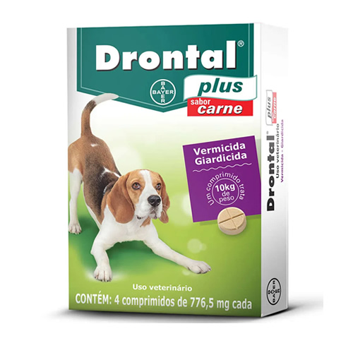 Drontal Plus® é indicado para o tratamento e controle das verminoses intestinais e de giardíase em cães, apresentando excelentes resultando contra parasitas cestoides (vermes chatos), nematódeos (vermes redondos) e protozoários. Drontal Plus® sabor Carne contém dois comprimidos de 776,5mg cada, que trata 10kg de peso corpóreo do cachorro.