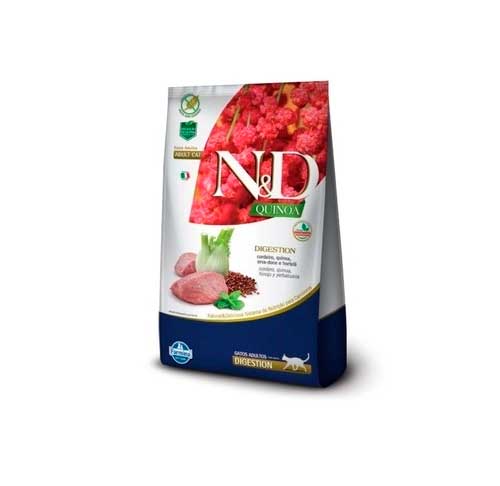 A Ração Farmina N&D Quinoa Digestion foi especialmente formulada para gatos adultos que apresentam sensibilidade digestiva. Contando com deliciosos ingredientes de alta qualidade como cordeiro quinoa erva-doce e hortelã o alimento completo e equilibrada promove longevidade e saúde ao felino. A ração enriquecida com frutas e legumes ainda oferece baixo índice glicêmico sem adição de conservantes artificiais glúten ou cereais sendo 92% de sua composição proteínas de origem animal. As quantidades sugeridas na tabela diária são recomendadas em gramas podendo ser alteradas de acordo com as condições físicas do pet e/ou recomendação do Médico Veterinário.