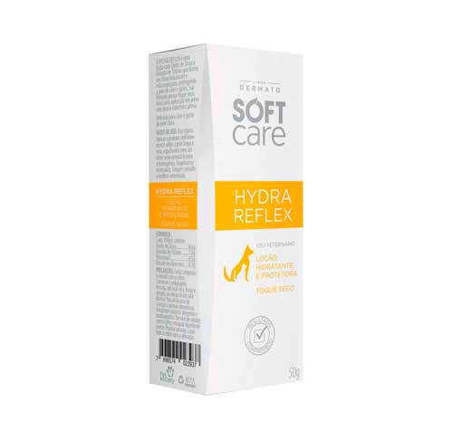 O Loção Hidratante Pet Society Soft Care Hydra Reflex hidrata e protege a pele dos cães e gatos, com o Óxido de Zinco e Dióxido de Titânio, deixando um leve cheiro de Aloe Vera, com um toque a seco, que permite que a loção seja aplicada em áreas sem pelos. A Loção Hydra Reflex possui uma formula com o PH balanceado, podendo ser utilizado em animais com peles sensíveis.