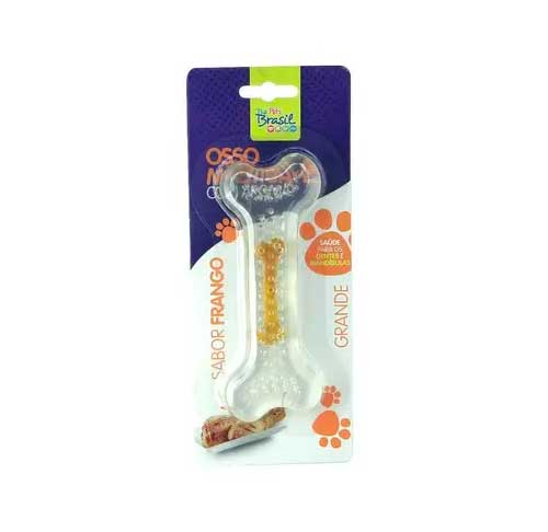 O Osso mordedor sabor frango da marca THE PETs BRASIL . Foi desenvolvido em Nylon especial e 100% atóxico. Promove atividade estimulante, entretenimento, além de satisfazer o desejo de mastigação, evitando o poder destrutivo e frequentemente para de mastigar tudo que encontram pela frente. Com a mastigação, surgem pequenas cerdas tipo de escovas que limpam os dentes e massageiam a gengiva. Como o Nylon não é abrasivo, os dentes não são desgastados, a ação da mastigação raspa a placa e ajuda no controle do tártaro. Não lasca, quebra, ou solta pedaços grandes. Não arremessar o produto no chão.