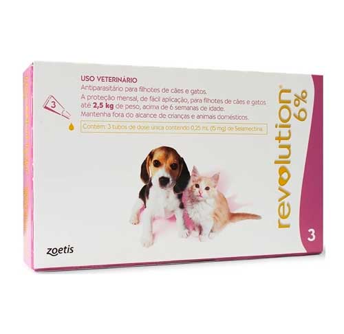 O Antipulgas e Carrapatos Pfizer Revolution 6% para Cães e Gatos até 2,5 kg é composto pela selamectina, uma solução pronta para uso para o tratamento tópico de cachorros e gatos filhotes. Inibe o desenvolvimento das larvas de pulgas do ambiente devido a sua ação residual. Trata e controla sarna de ouvidos e sarcóptica, vermes intestinais e piolhos sugadores e mordedores.