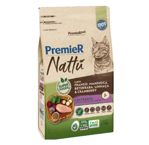 Formulado com ingredientes nobres, sem corantes e aromatizantes artificiais, PremieR Nattu Gatos Castrados é recomendado a partir dos 6 meses de idade para os felinos que passaram por este procedimento cirúrgico e que necessitam de uma dieta equilibrada.