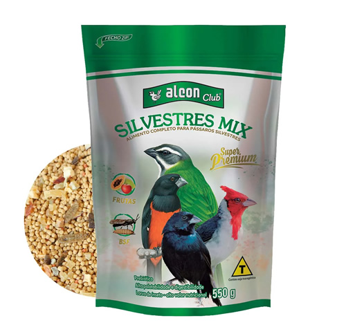 Alcon Club Silvestres Mix é um mix de ração, frutas e insetos, fazendo dele um alimento completo Super Premium, cientificamente elaborado para suprir as necessidades nutricionais e energéticas de Pássaros Silvestres adultos durante a fase de manutenção.